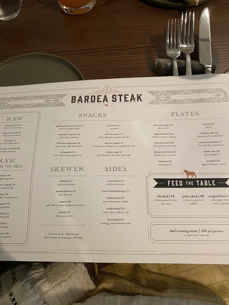 Bardea Steak, located in Wilmington, DE, offers a diverse menu with a variety of options to choose from. From unique snacks like bao bun beef cheek and BBQ pork pear to main dishes like beef tartare cheesesteak and bluefin tuna beet teriyaki, there is something for everyone at Bardea Steak. The restaurant's classy atmosphere and outdoor seating make it a perfect spot for a special night out or a casual meal. The menu also features options for those looking for a seafood experience, including a seafood tower and mussel toast. Overall, Bardea Steak provides a high-quality dining experience with a focus on fresh ingredients and creative flavor combinations. I highly recommend trying out their dishes for a memorable culinary experience.